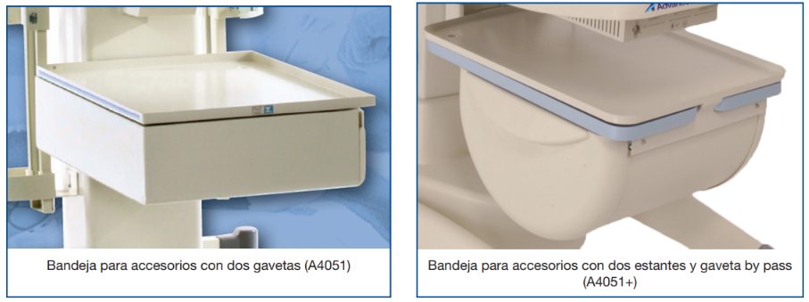 - Diseño funcional: bandeja porta monitor, poste de suero, soporte para 2 cilindros, bandeja para rayos X, ruedas con freno.